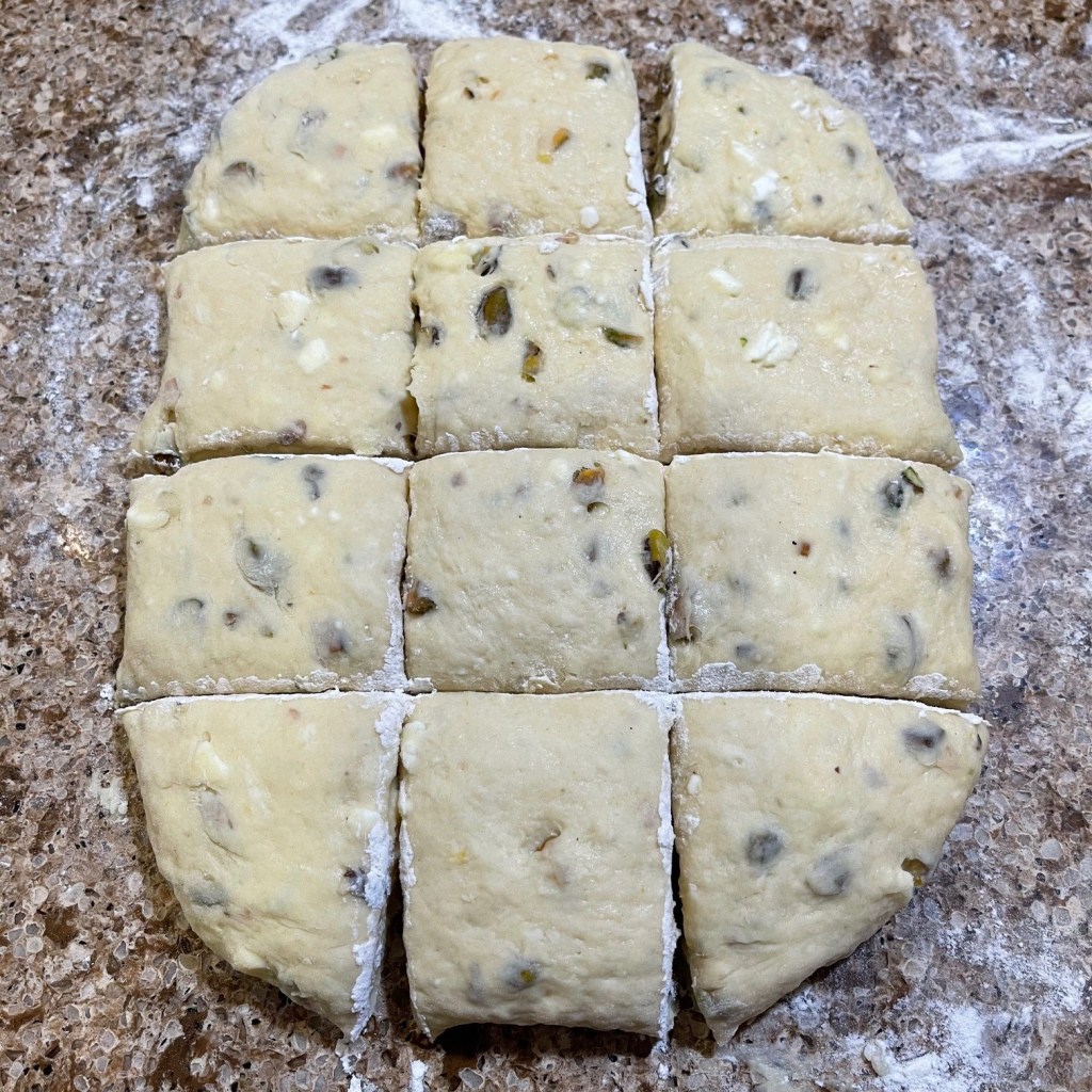 Empty the bowl onto a floured large breadboard or counter. Knead the dough about 20 times to unite all the flour into the batter. With your hands, shape the dough into a 1″ thick rectangle. Cut the dough into 12 squares.