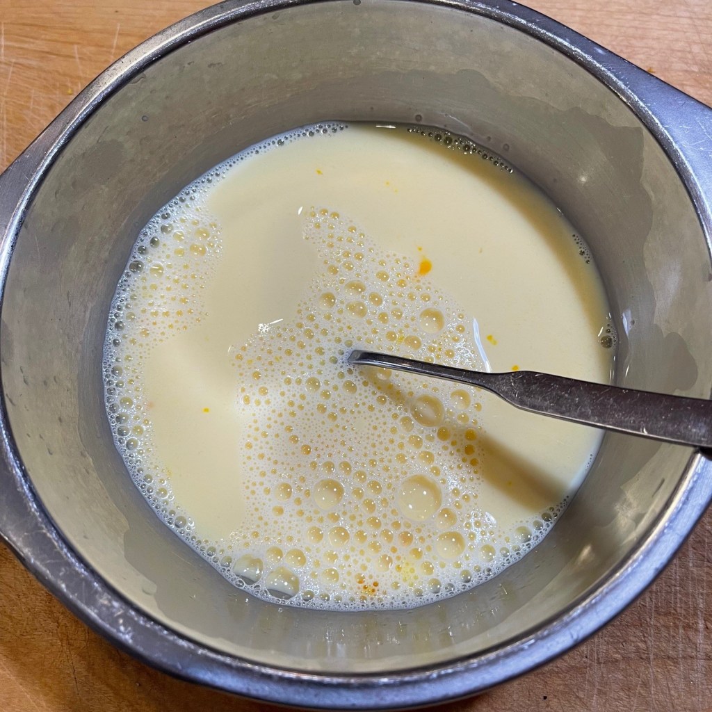 In a large mixing bowl, beat eggs with a fork just to break them up. Pour in milk, as you continue to beat eggs.