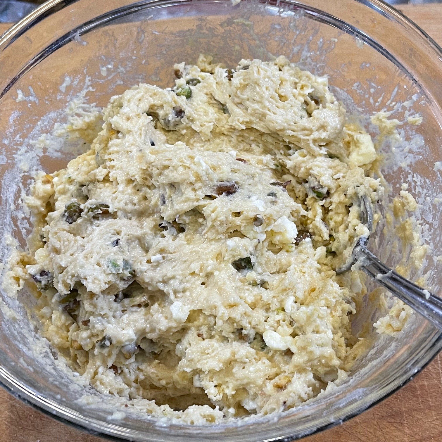 Stir the feta and pistachios into the egg mixture. Pour the flour mixture into the eggs, blending with a spoon until most of the flour is incorporated.