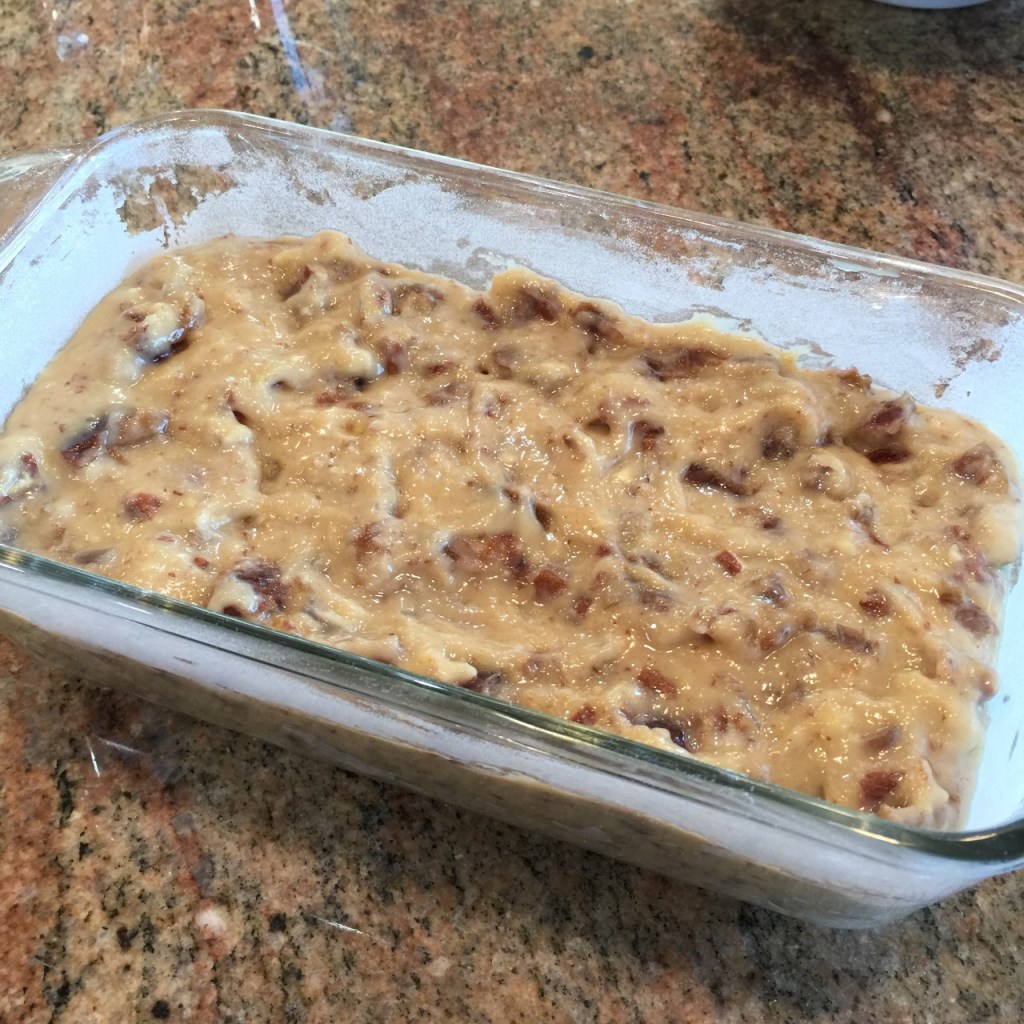 Pour batter into a greased and floured loaf pan – I use a Pyrex glass pan.