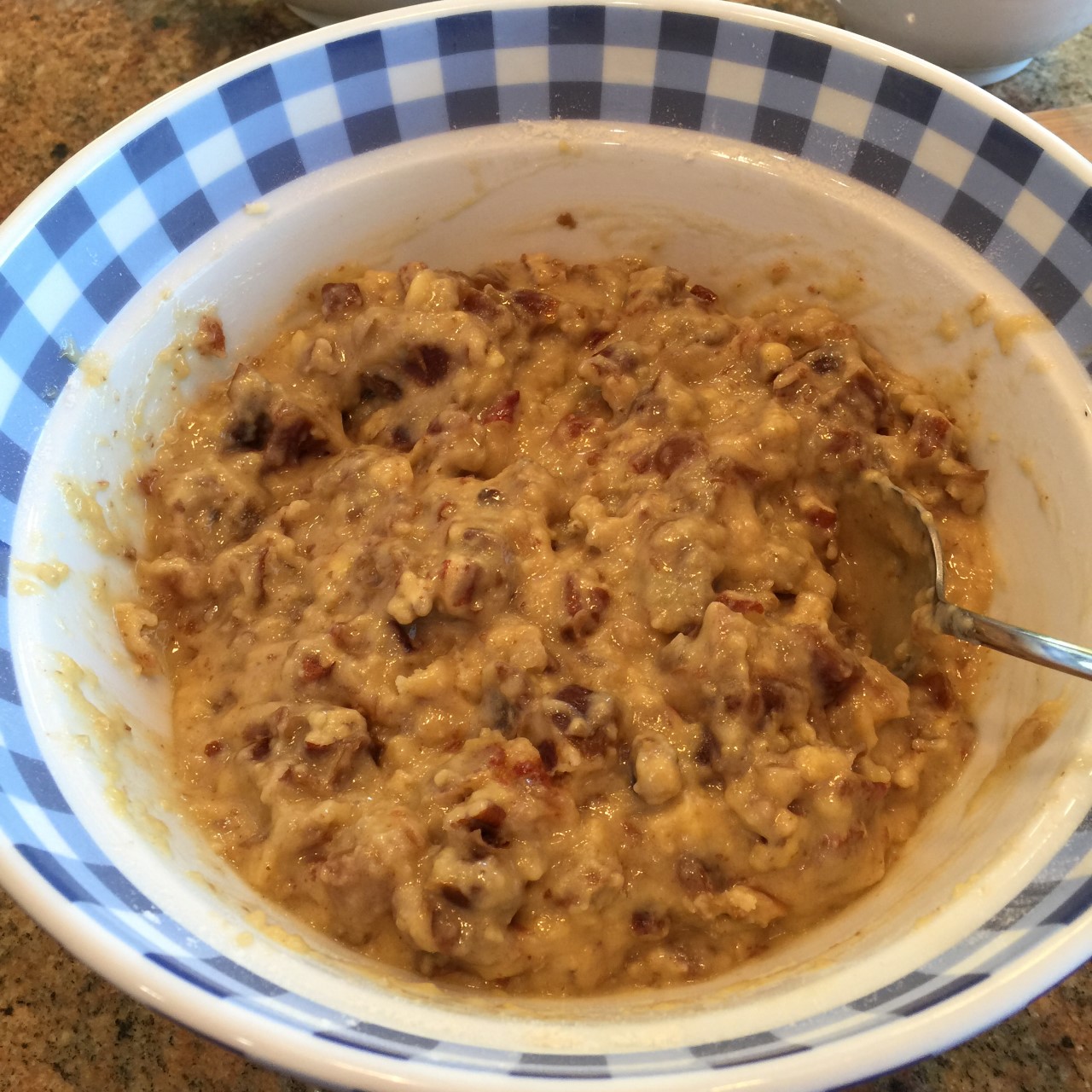 Into a mixing bowl, beat the egg. Add in the softened butter, dates (WITH liquid), flour, sugar, vanilla, baking soda, and pecans. Blend together until the flour is just incorporated – don’t overmix or the bread can toughen.