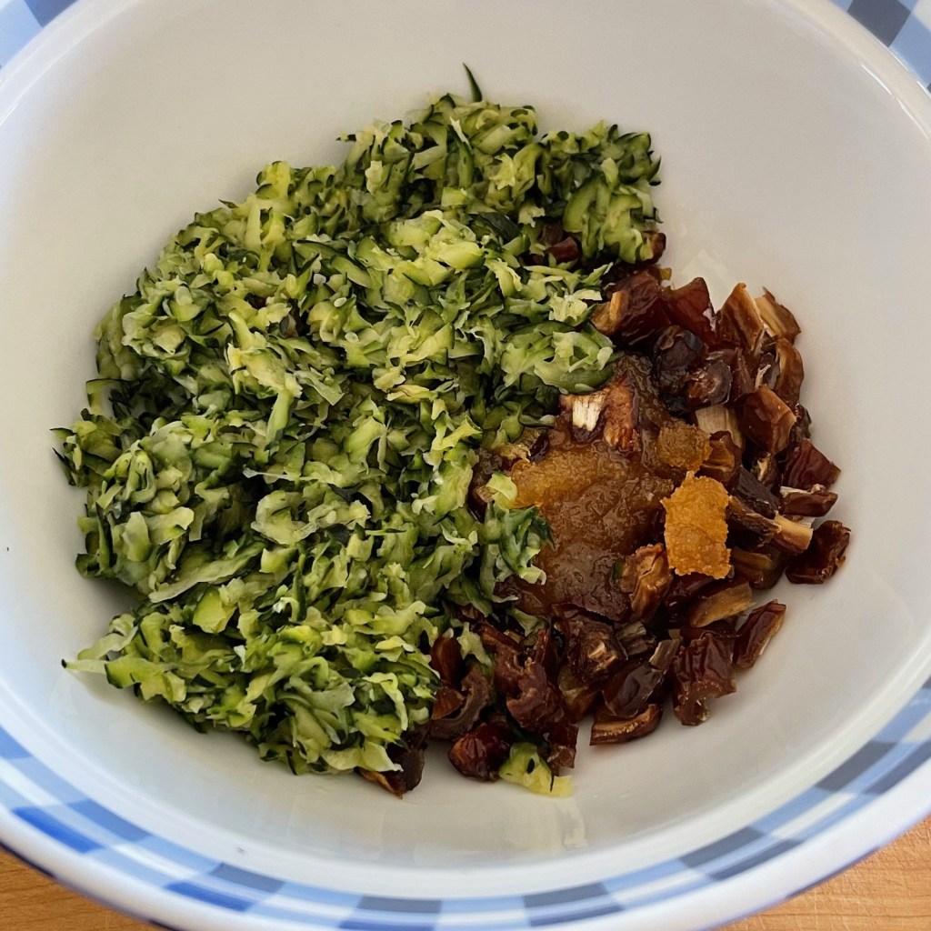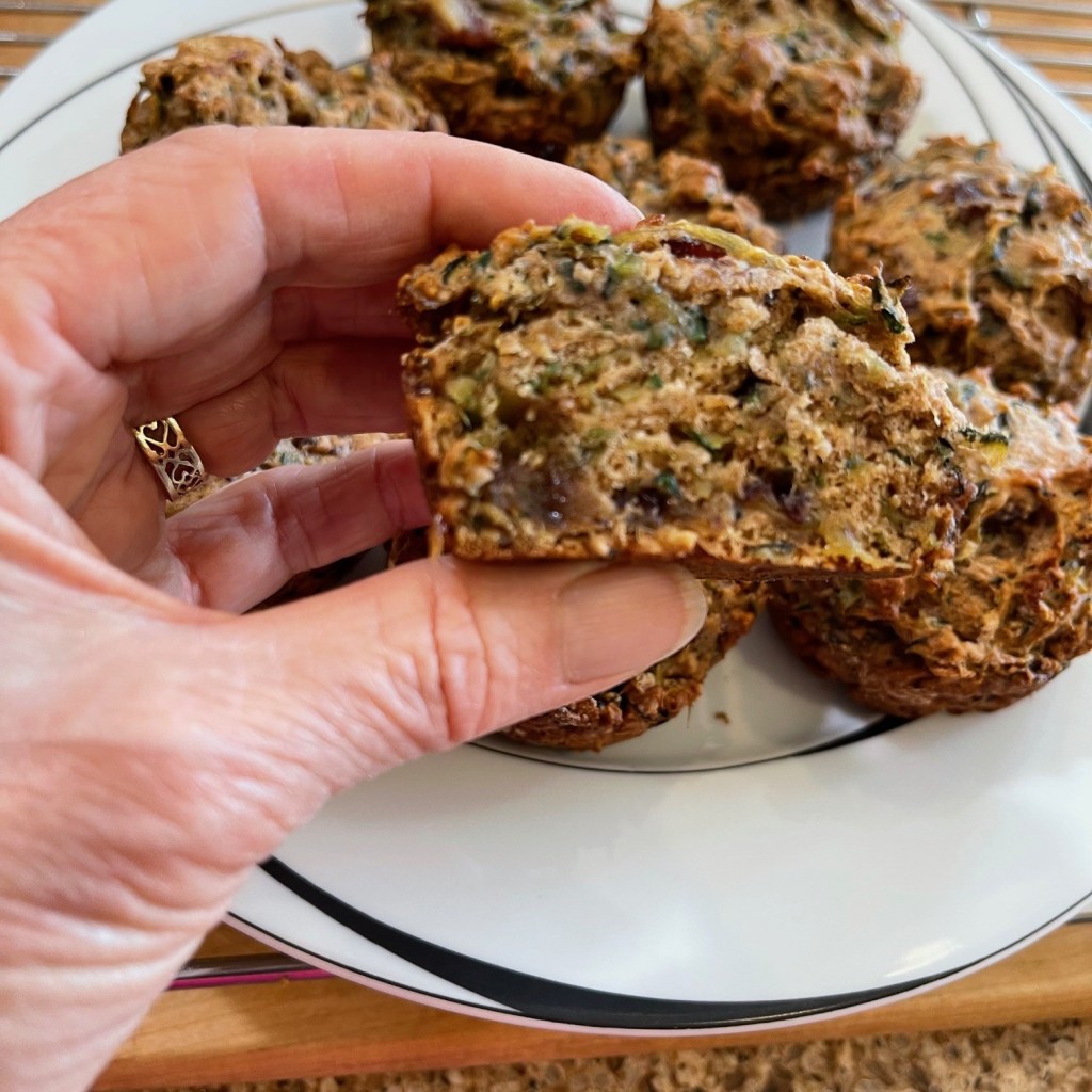 ZUCCHINI-DATE -APRICOT MUFFINS – (Makes 6-9 muffins, depending on size.)