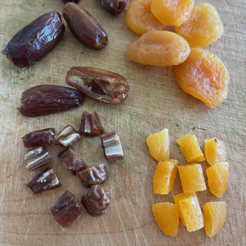 Chop the dates and apricots into small pieces. Add them to the bowl with the egg whites.