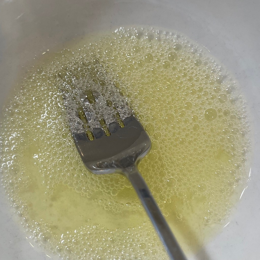 Into the medium sized bowl, put the egg whites and beat with a fork to break them up and they become foamy.