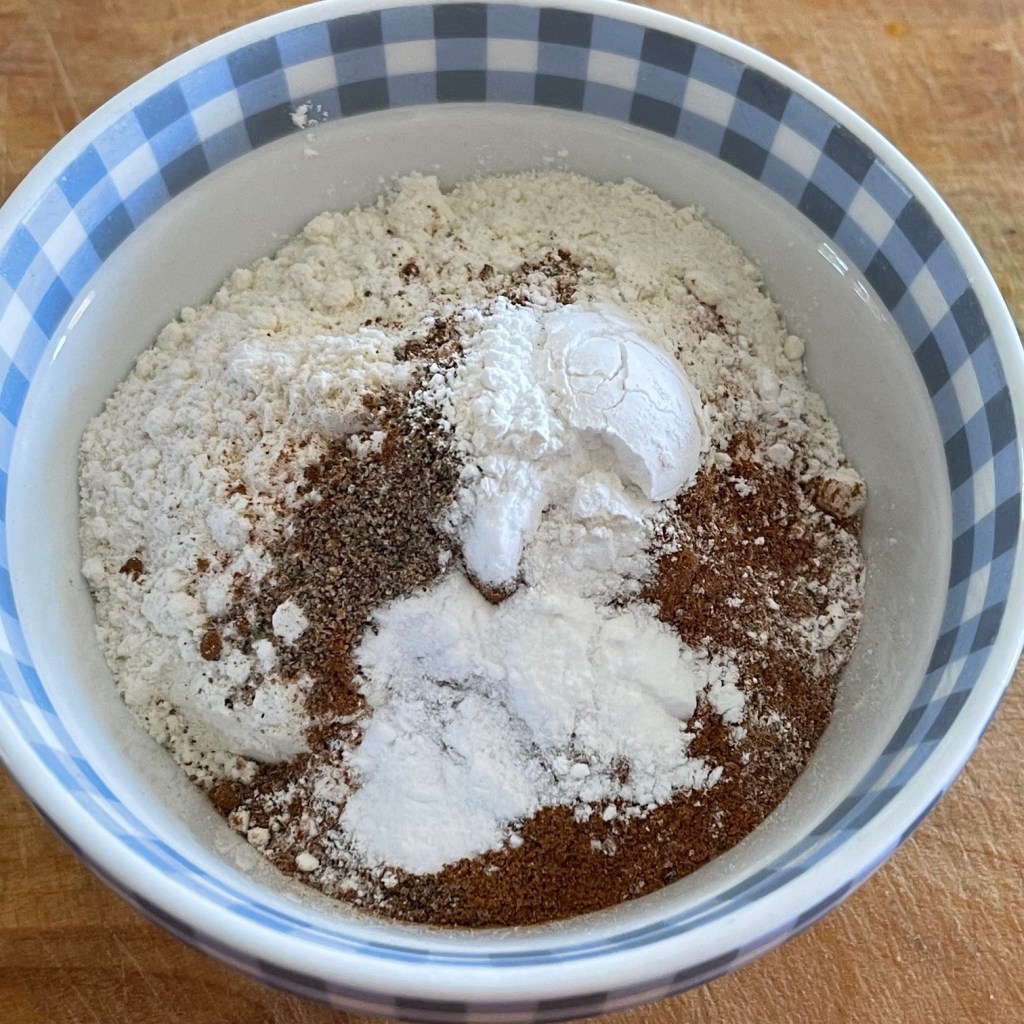 Into the smaller bowl, stir together the all-purpose (plain) flour, whole wheat flour, salt, cinnamon, cardamom, nutmeg, baking powder, and baking soda.