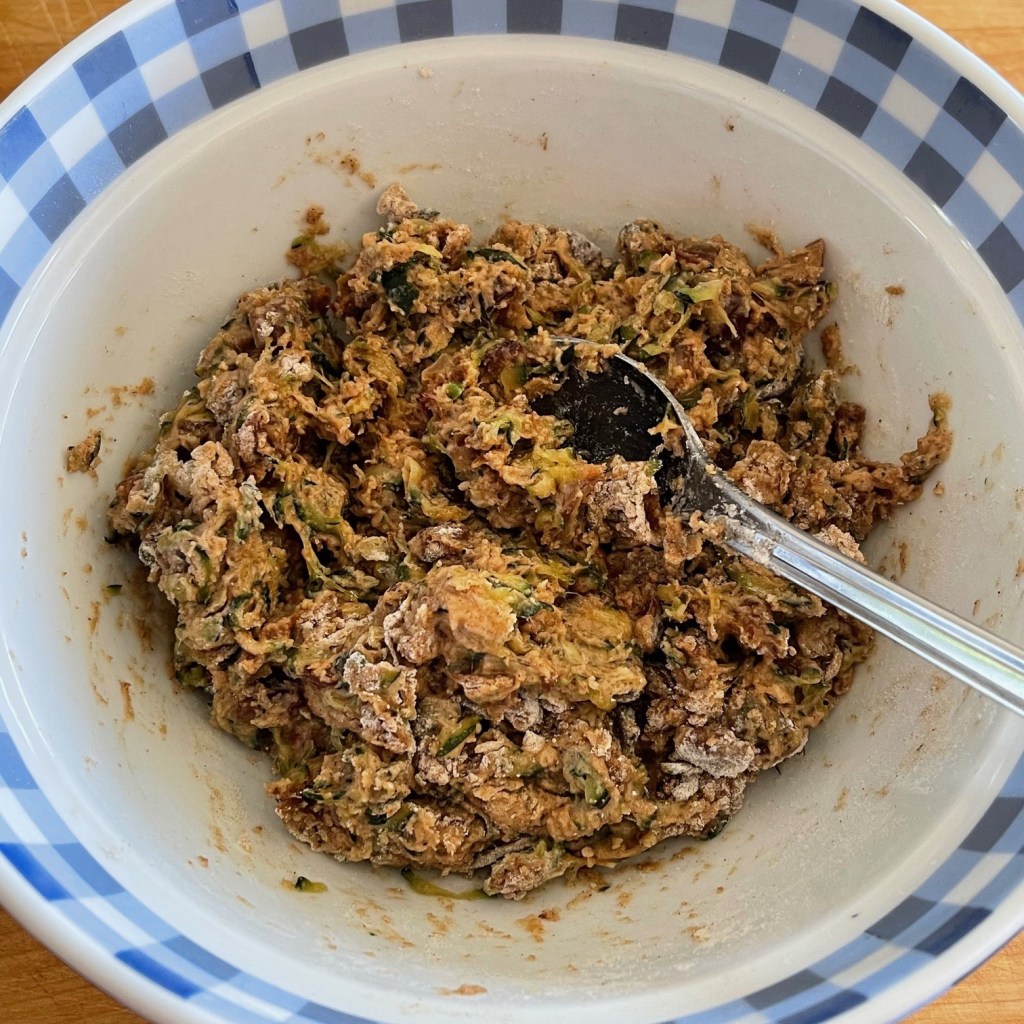 Shred, then chop the zucchini. (I chop the shreds so the muffins don’t have long zucchini strings.)