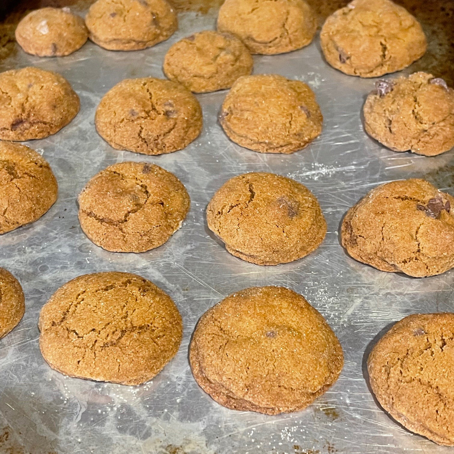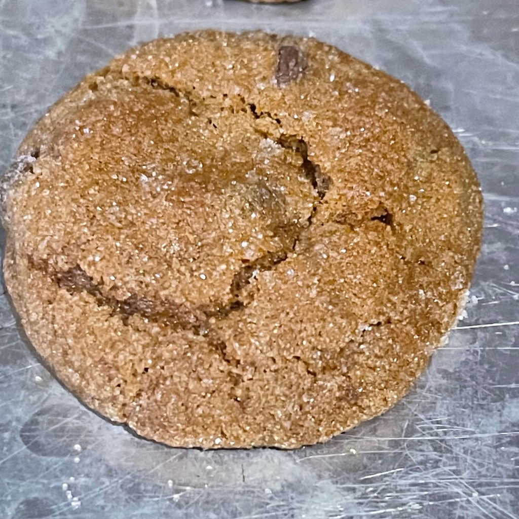 Bake at 375º F for 9-10 minutes. The key is to look at the edges, not the center. The edge should start to look baked, but the center should not be browned. Because the cookies will continue to cook on the hot sheet out of the oven, if you wait to remove them from the oven until they look baked, they’ll be overcooked.
