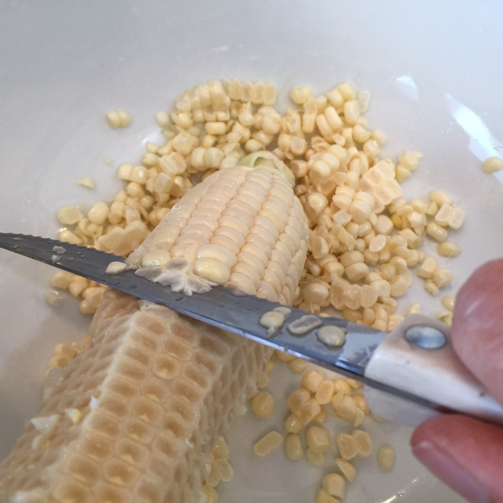 Remove the husk and silk from the corn cobs, then wash and dry them. Next (this may sound daunting, but I promise you it’s not) holding each cob at an angle, remove the kernels by running a sharp knife down the sides. It’s easiest to begin a couple of inches from the top and work downwards, away from you. Then flip the cob, and remove the bit that was at the top in the same manner. You’ll get about 3/4 cup of corn from each cob – I found that amazing.
