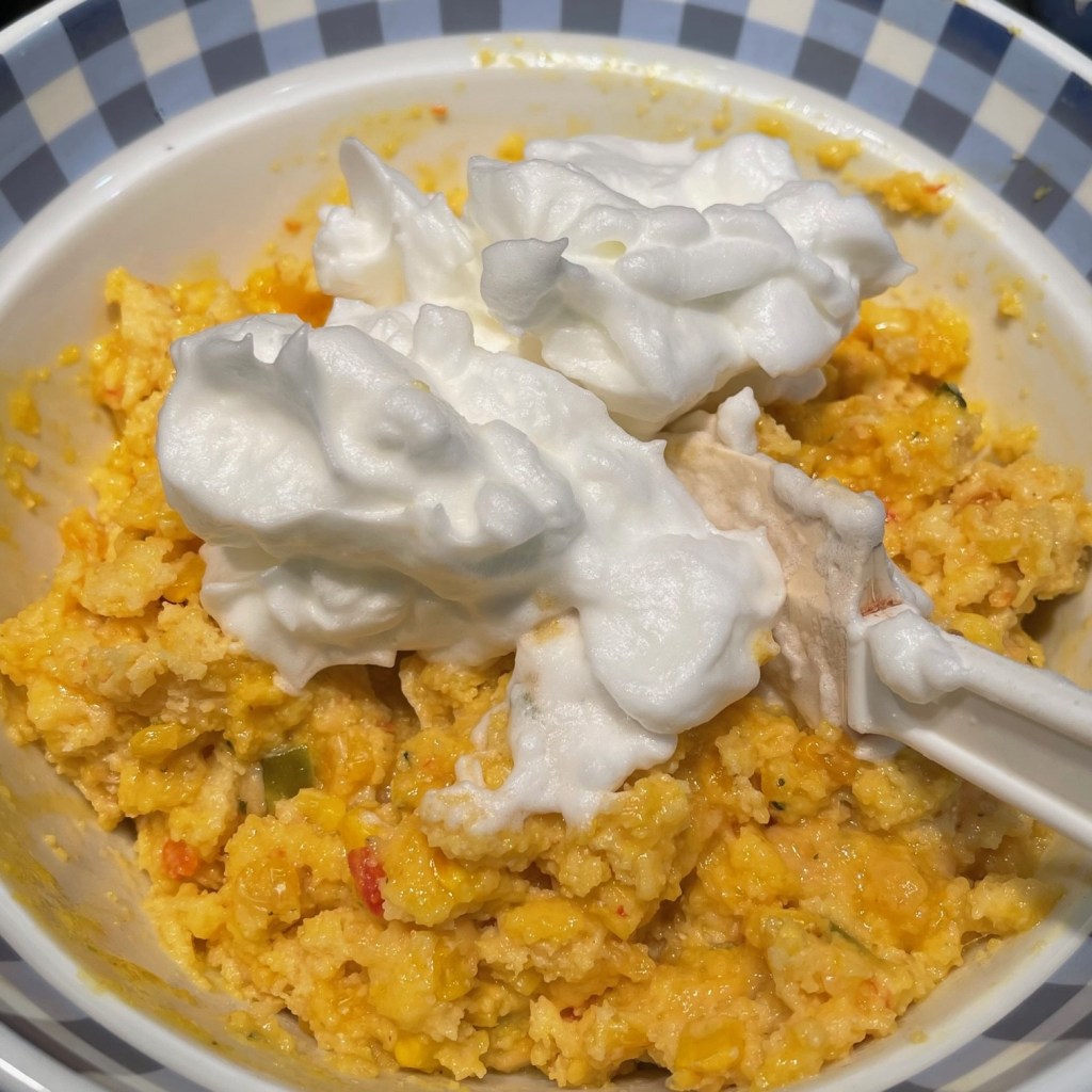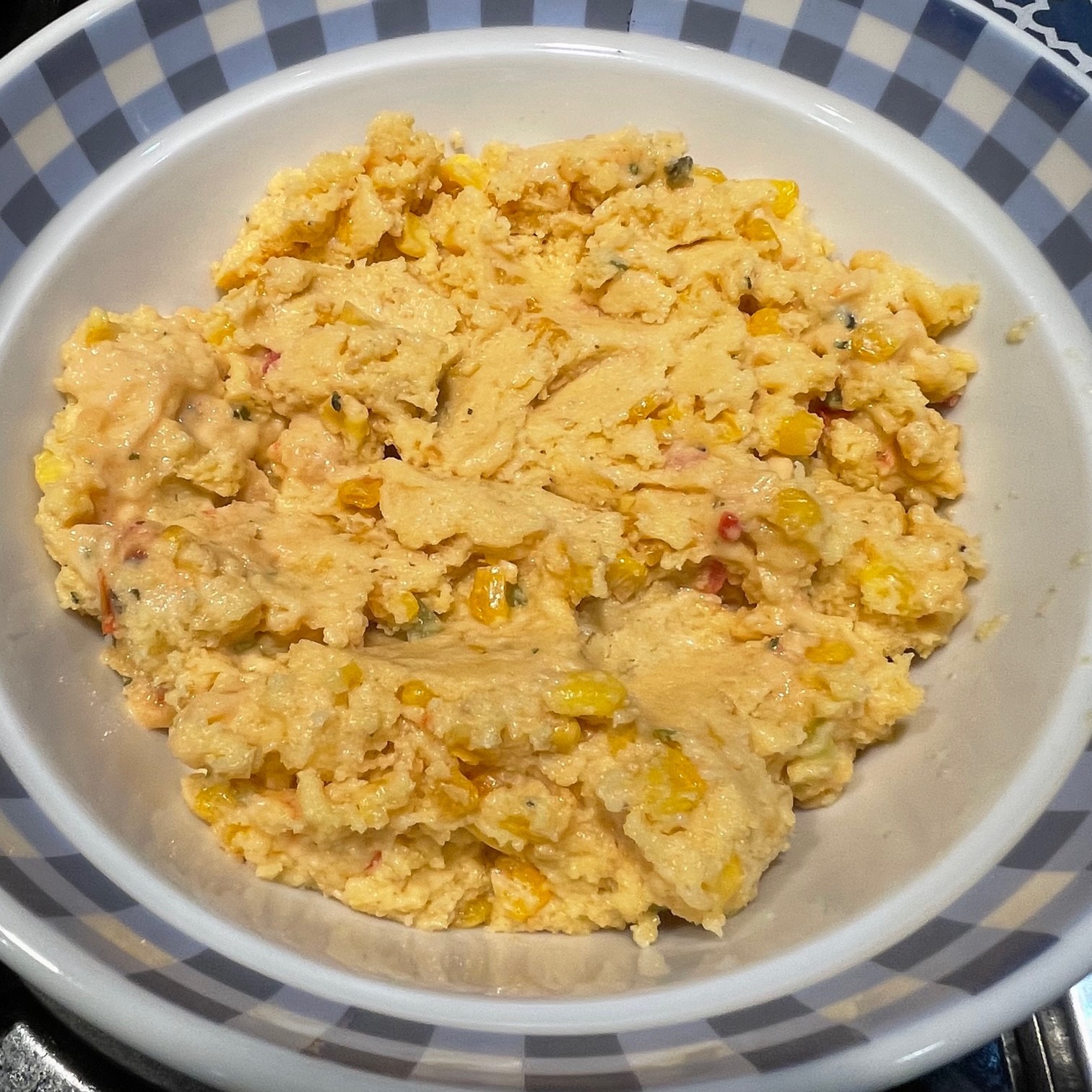 As is my usual practice, I followed the recipe the first time I made it. It was good, but I doubted I’d ever make it again (even though it was pretty simple). Then I spied the leftover CHILI CON QUESO from a previous blogpost. Hmmm! I wondered if it could be incorporated into the spoonbread to kick it up a notch.