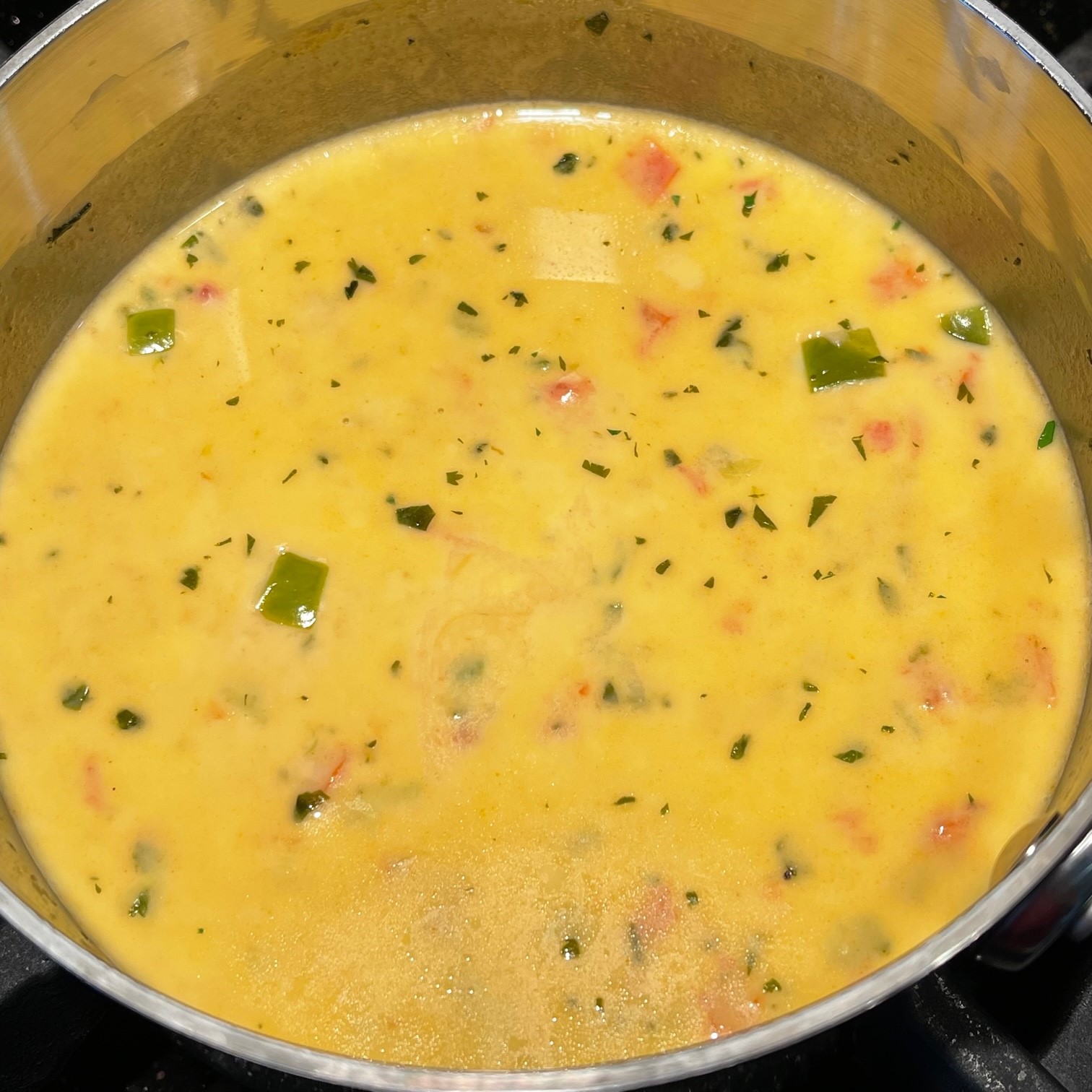 Bring corn mixture to a simmer and stir until it thickens – about 5 minutes. Shut off flame and stir in the chili con queso.
