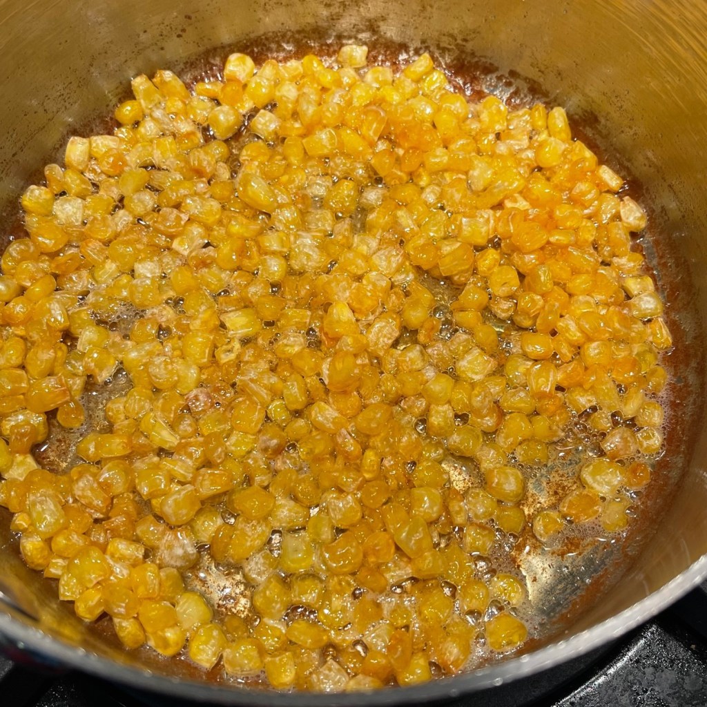 In a saucepan, melt the butter and cook corn over medium flame, until it begins to brown – about 15 minutes. Stir often.
