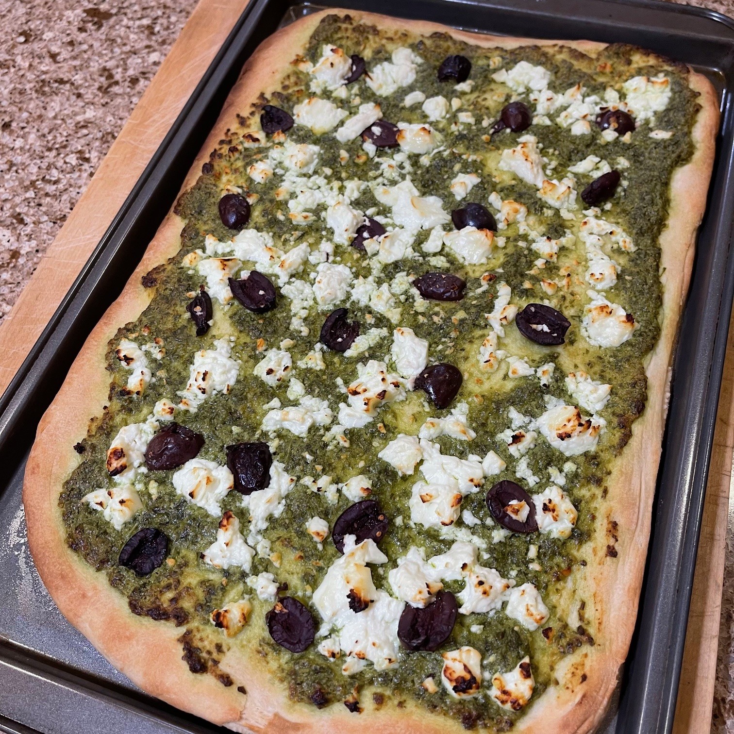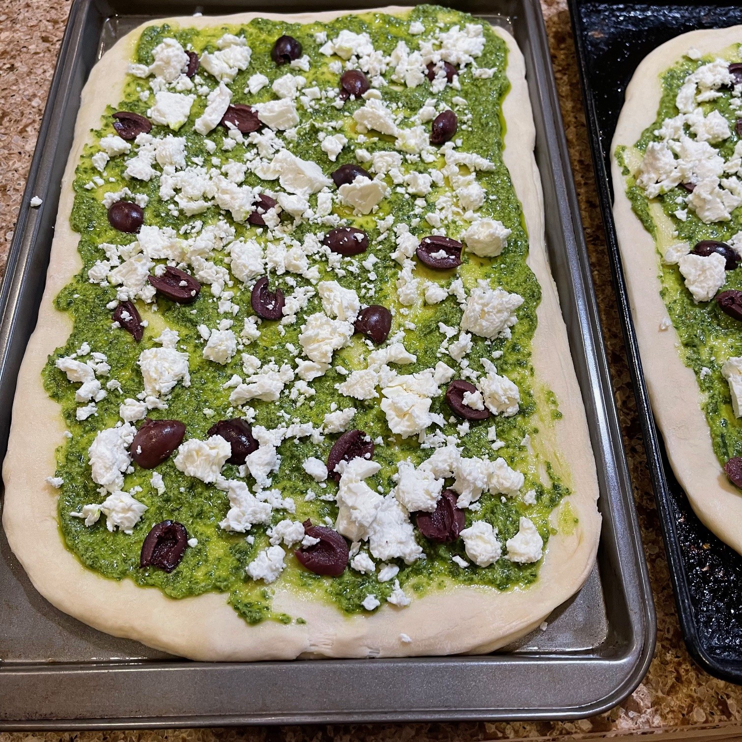 Top risen pizzas with your preferred amount of pesto, crumbled Feta, and Kalamata olives.
