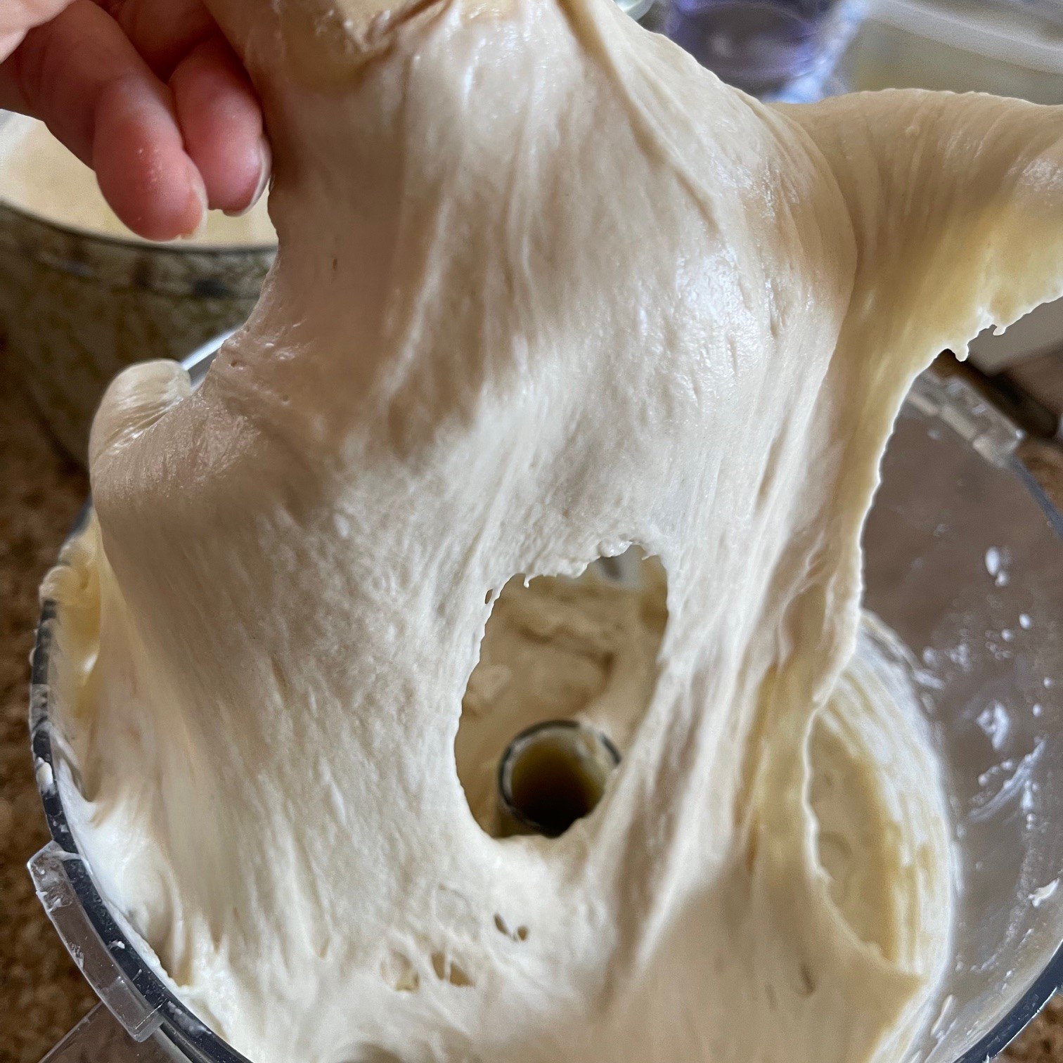 Now comes the icky part. Remove the blade and scrape off the dough. You’ll notice how stretchy and sticky the dough is.