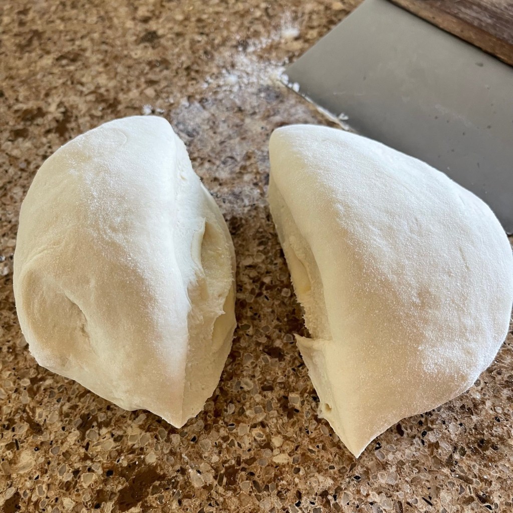 Empty the dough onto a well floured surface. Using a bench scraper underneath the dough, begin kneading 6 or 7 times to bring the dough together, sprinkling with flour as needed. Cut the dough in half.