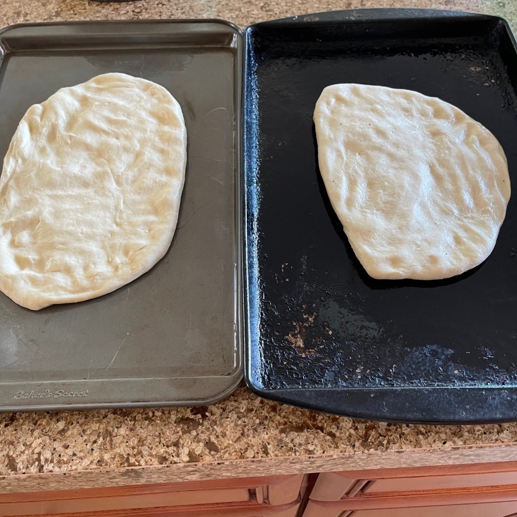Put 2 tablespoons olive oil in each of the two pans. (Don’t be tempted to use more olive oil – it will be difficult to stretch the dough on a slippery surface.) With your fingertips, spread the oil around the pan. Plop one dough half in each pan, flipping them over to cover both sides with a bit of oil. With your slightly oiled fingertips, work the dough to stretch it out to about 20cm x 13cm (8″ x 5″). Don’t worry about it being exact. Cover pans and let rise about 1.5 hours.
