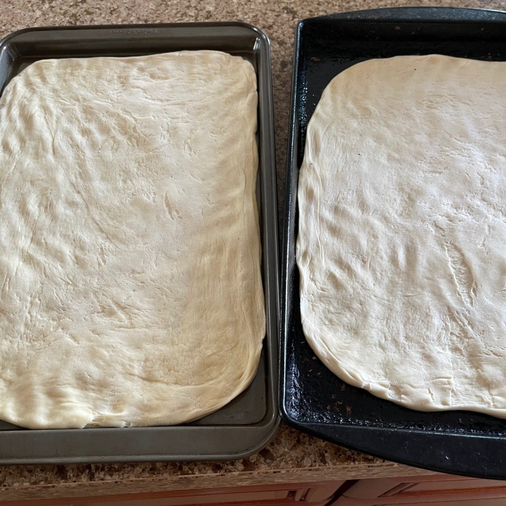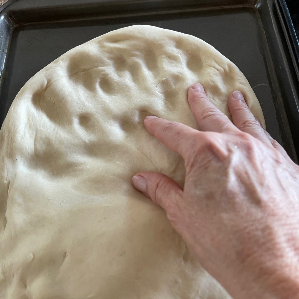 NOTE 2: A rimmed baking sheet is preferred to define the rectangular shape but, if you don’t have one, just use a large baking sheet and shape the dough as best you can. As you can see from the photo above, dough seems to have a mind of its own, and occasionally refuses to fill in the corners anyway.