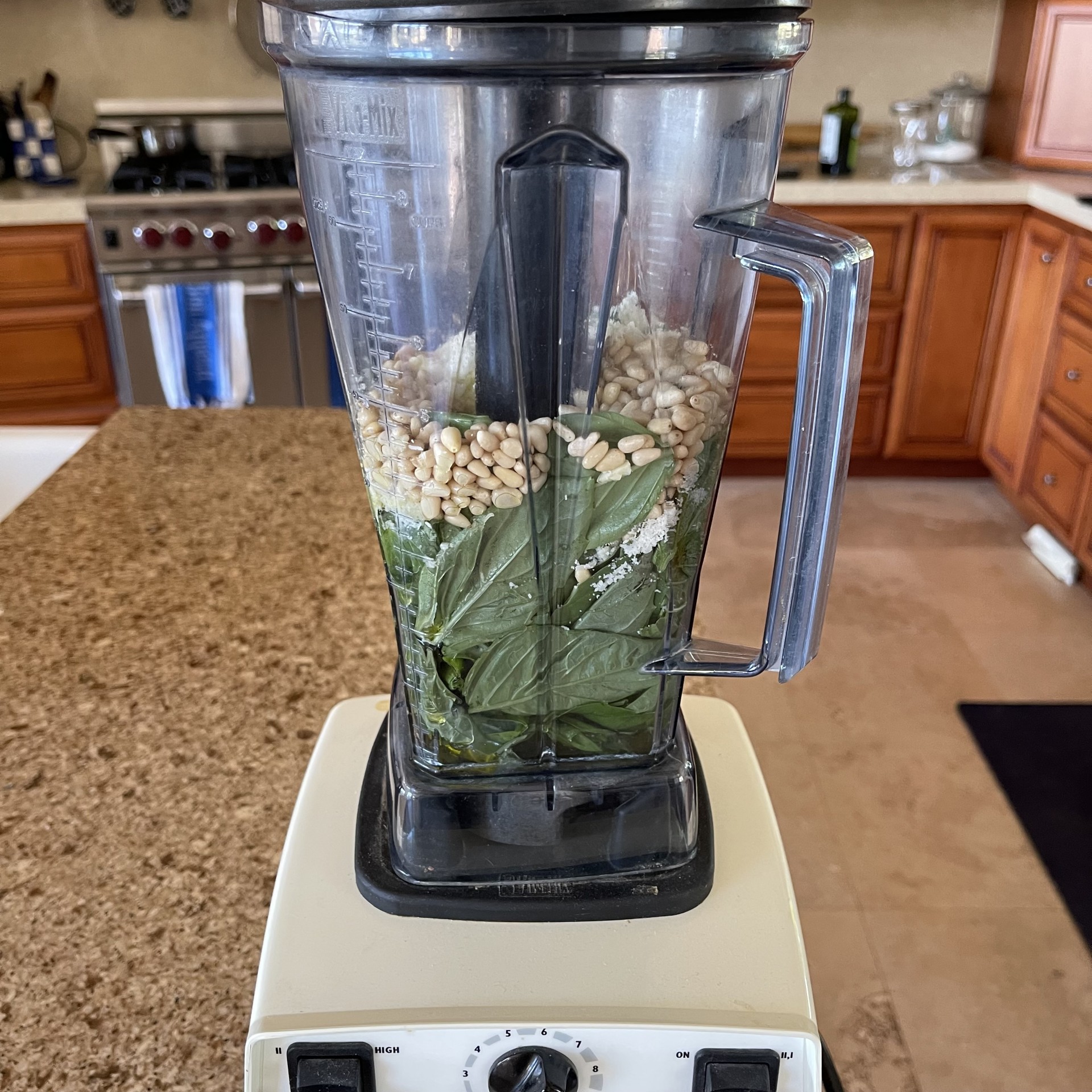 Into a blender put all the ingredients (basil, garlic, lemon juice, Pecorino/Romano, pine nuts, salt, and olive oil).