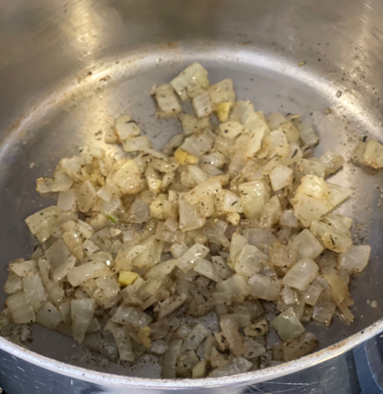 Heat oil in large skillet – I used a 14″ stainless steel pan. When oil is shimmering, add onions and sauté over medium/high for 2 minutes. One by one, continue to add eggplant, red pepper, garlic & spinach together, zucchini, and finally the tomatoes, cooking each 2 minutes before adding the next. Stir in the salt and pepper.