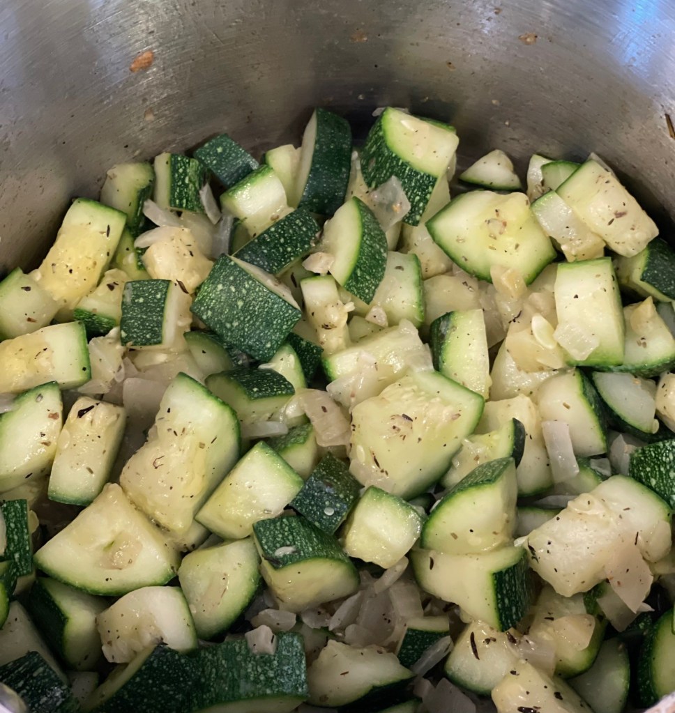 Add in zucchini and, over medium-high heat, saute 5 minutes, stirring often.
