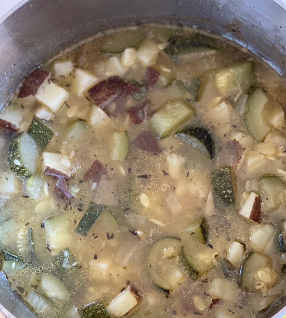 Add the potatoes, vegetable broth, soy sauce, and couscous to the pot. Bring to a boil, then decrease flame to maintain a simmer.