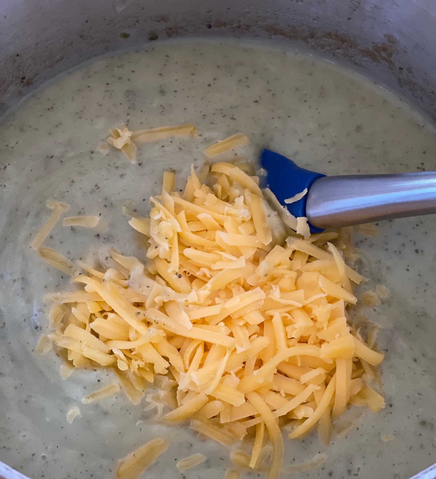 Return soup to saucepot and stir in cheese, optional greens, and optional bread pieces. Heat to melt cheese. Taste for seasoning, correcting if needed.