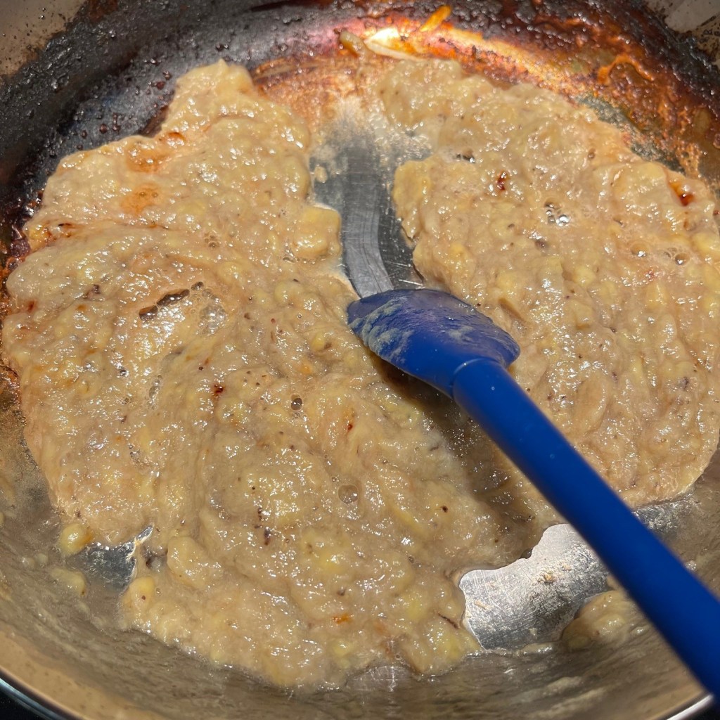 Over medium/high heat, cook the bananas, stirring often, until most of the water has been cooked out – about 11 minutes. Remove from heat.