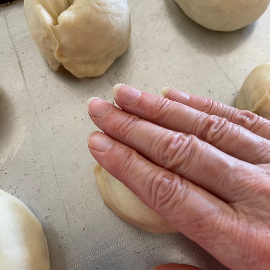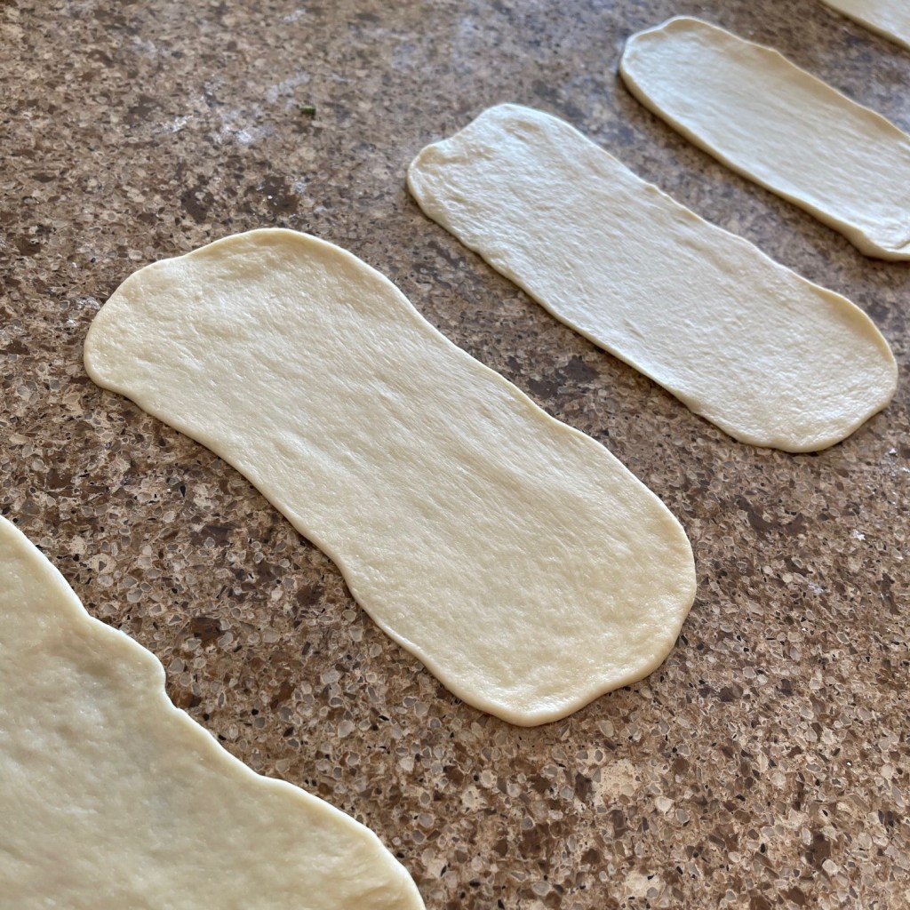 Empty the risen dough onto a lightly floured surface and divide it into 6 pieces. Roll each piece into a 9″x 4″ (23cm x 10cm) strip.