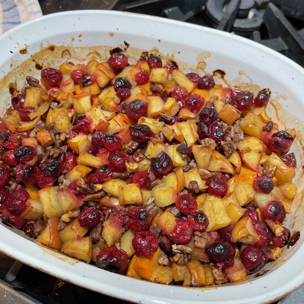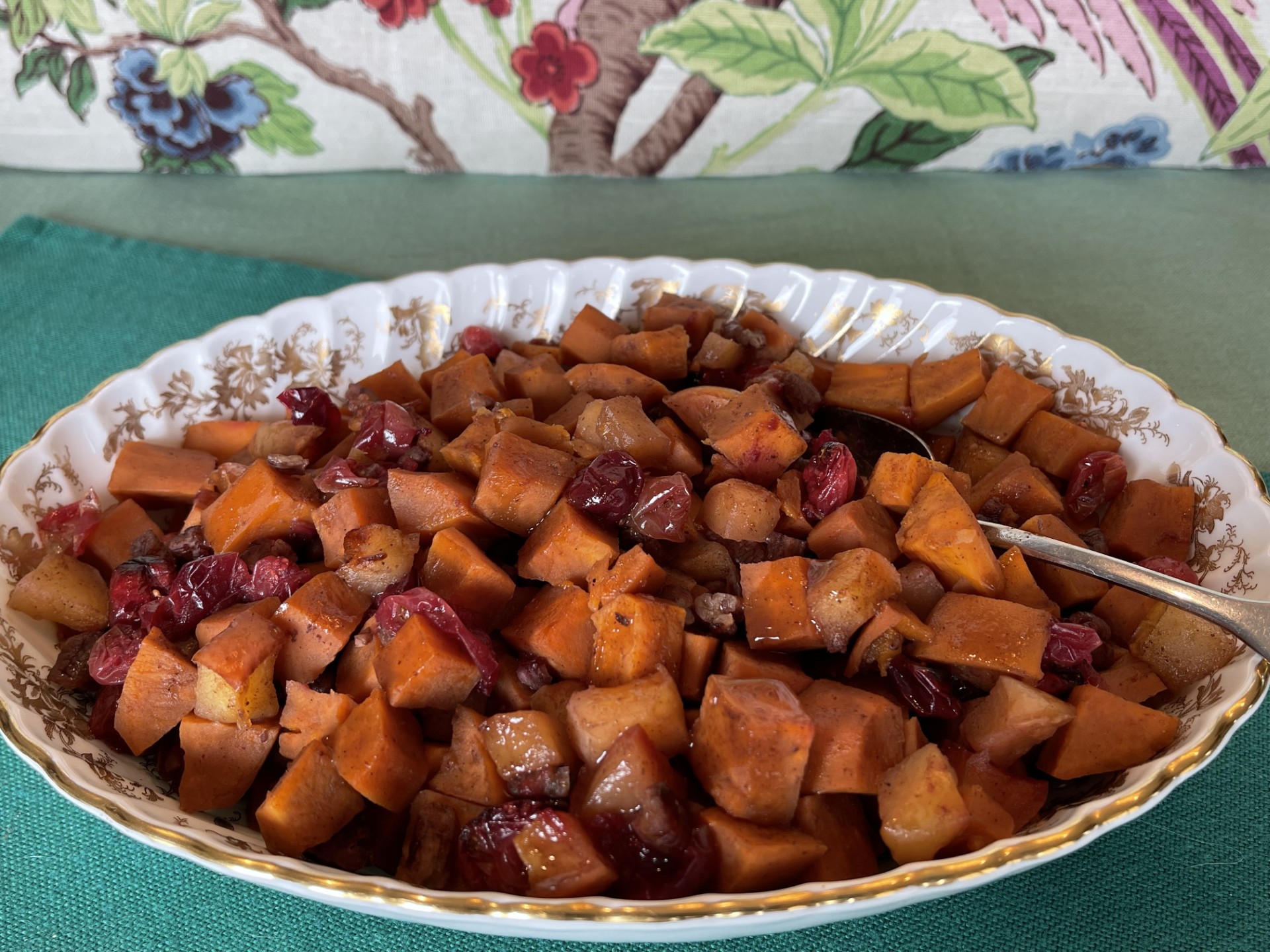 Into a bowl, combine the cranberries, apple, pecans, brown sugar, orange juice, Cointreau, cinnamon, and nutmeg. (In other words, combine everything except the yams.)