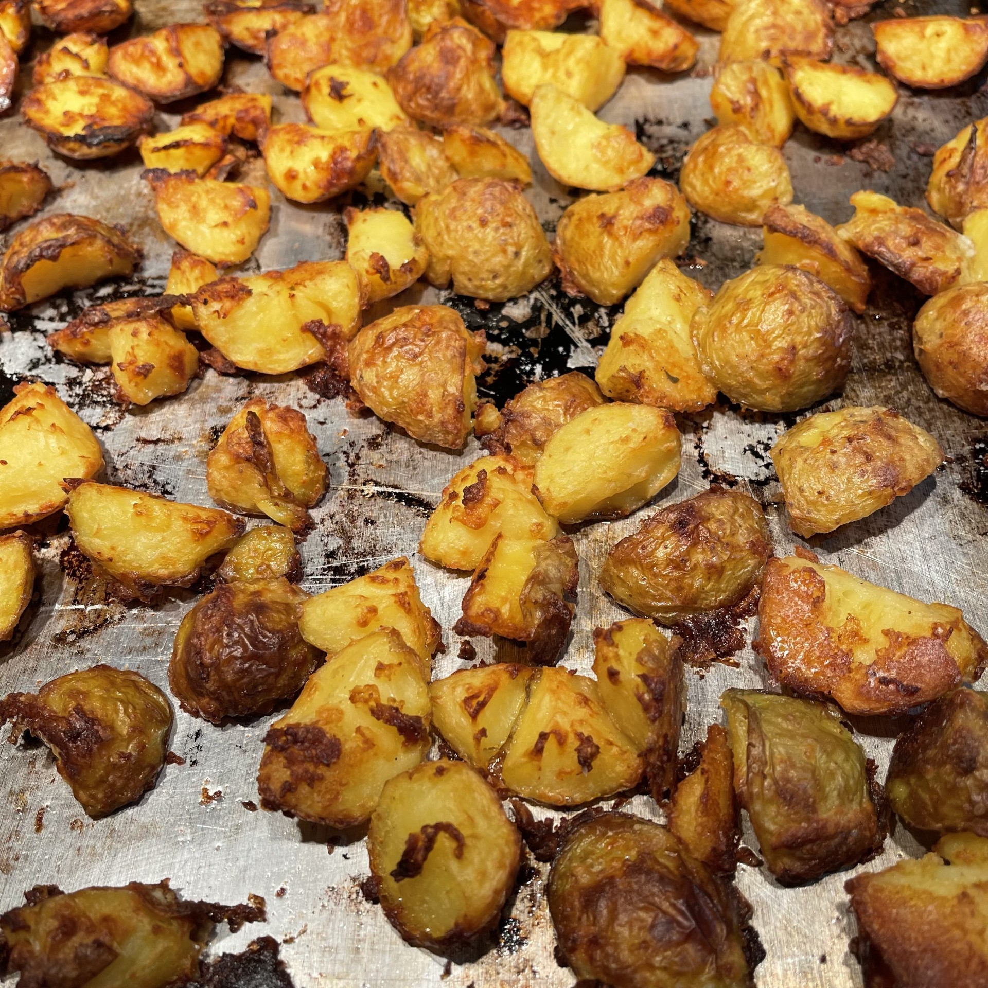 This Cheesy Roasted Potato recipe has been a game changer. There’s no deep frying and, in fact, there’s no oil except for the slight smear on the baking sheet to prevent sticking.