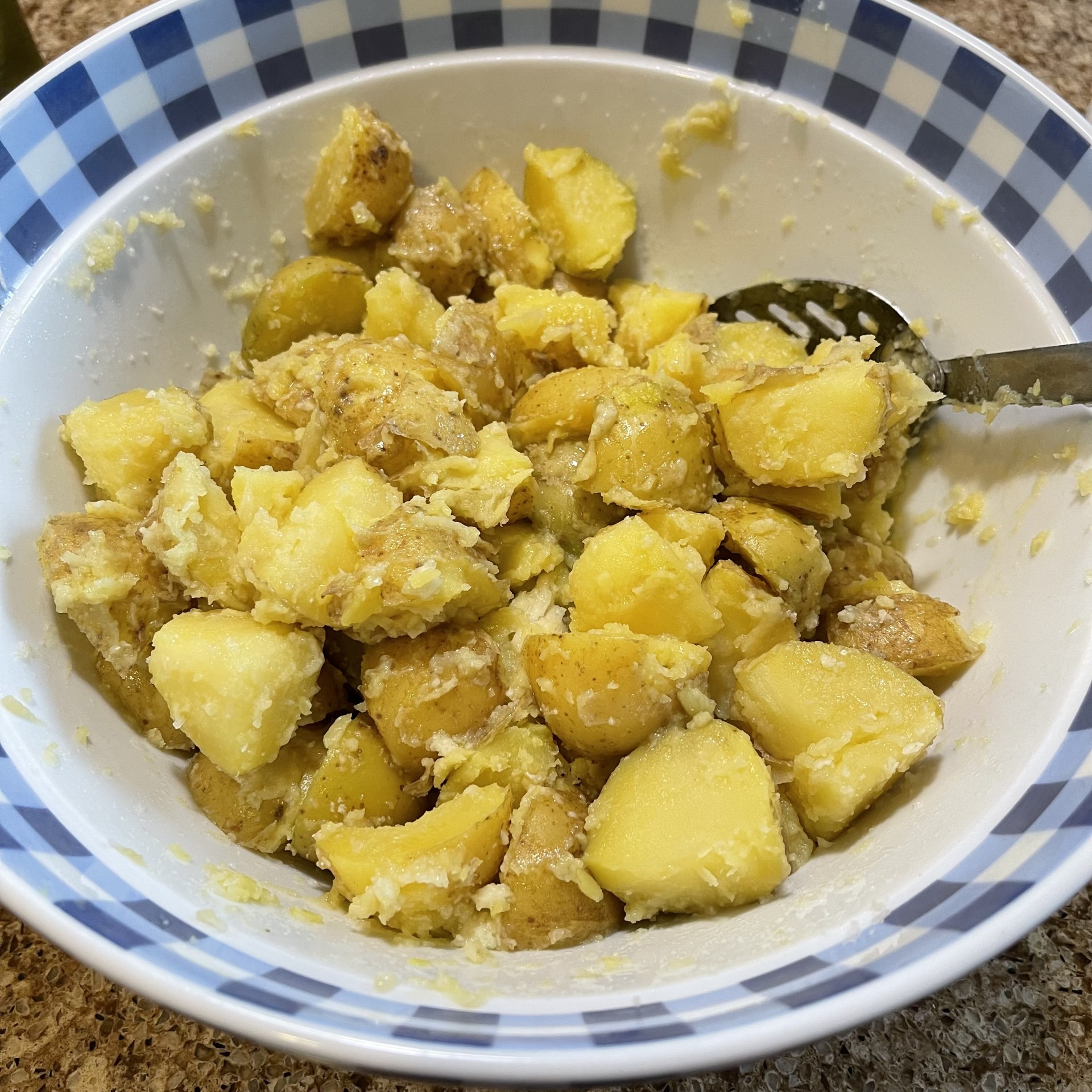 Empty potatoes into a large bowl. Melt the butter. Pour the butter, Pecorino, salt, and ground pepper into the potatoes. With a large spoon, vigorously stir all for 30 seconds. The idea is to slightly break down the potatoes but not mash them – we still want the wedges whole.